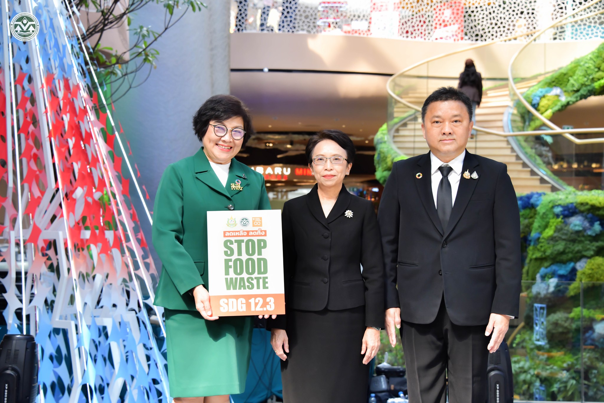 นางเสาวรส แสนสุข ผู้แทนประธานเครือข่ายมหาวิทยาลัยยั่งยืนแห่งประเทศไทย มหาวิทยาลัยเทคโนโลยีพระจอมเกล้าพระนครเหนือ ร่วมกิจกรรม Kick Off โครงการลดเหลือ ลดทิ้ง : Stop Food Waste SDG 12.3